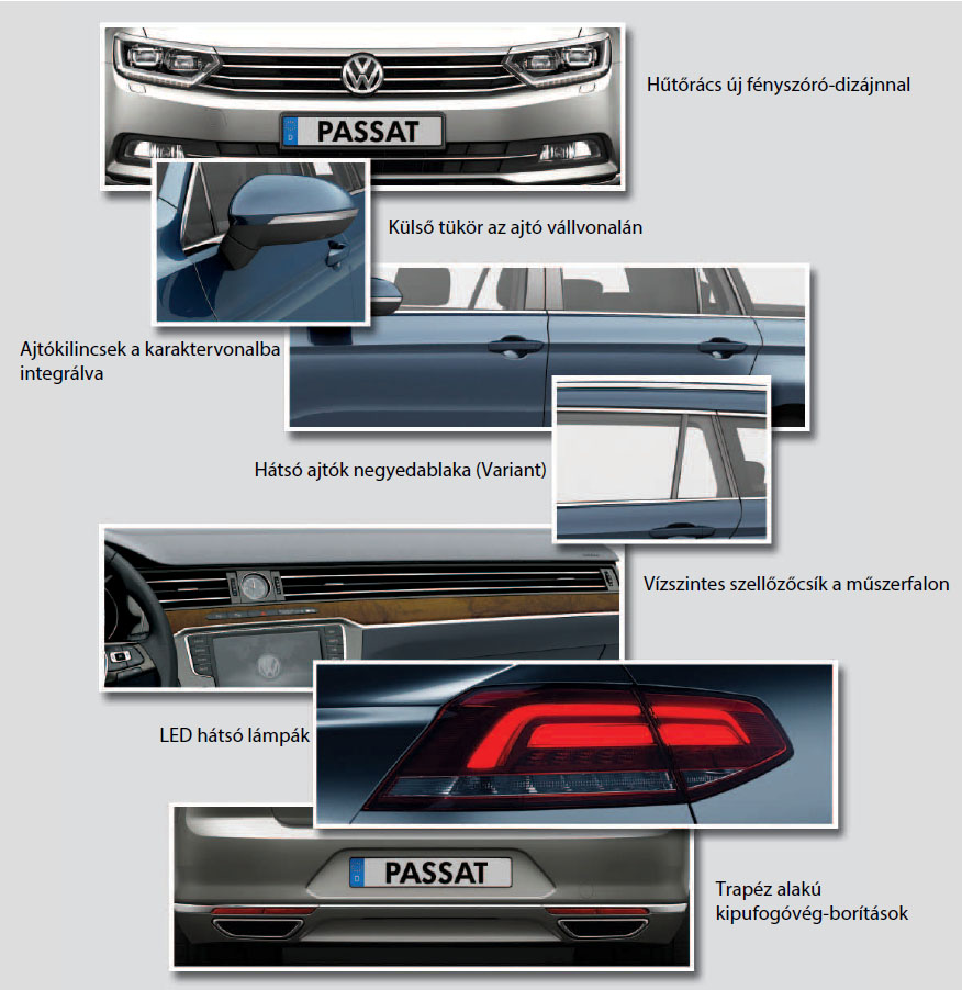 Az ábra a Passat Limuzin és a Passat Variant új és fontos termékjellemzőit sorolja fel.
