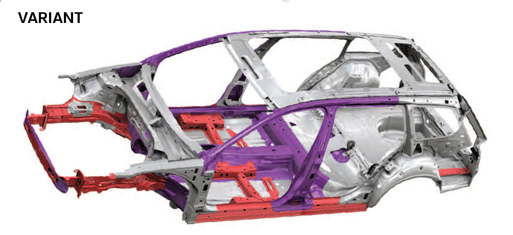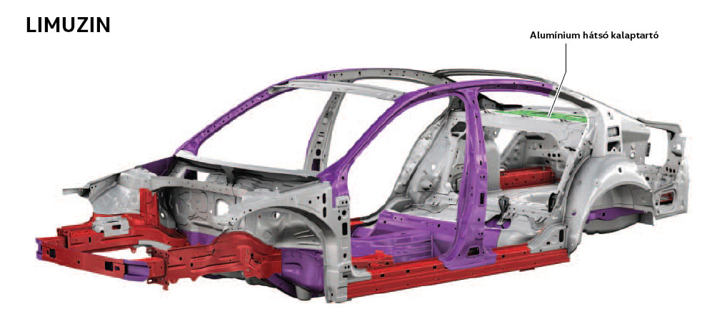 Ez a következetesen alkalmazott geometriai könnyűszerkezetes tervezés eredménye, és jól mutatja a nagyszilárdságú, illetve melegen alakított acélok fokozott használatának pozitív hatását.